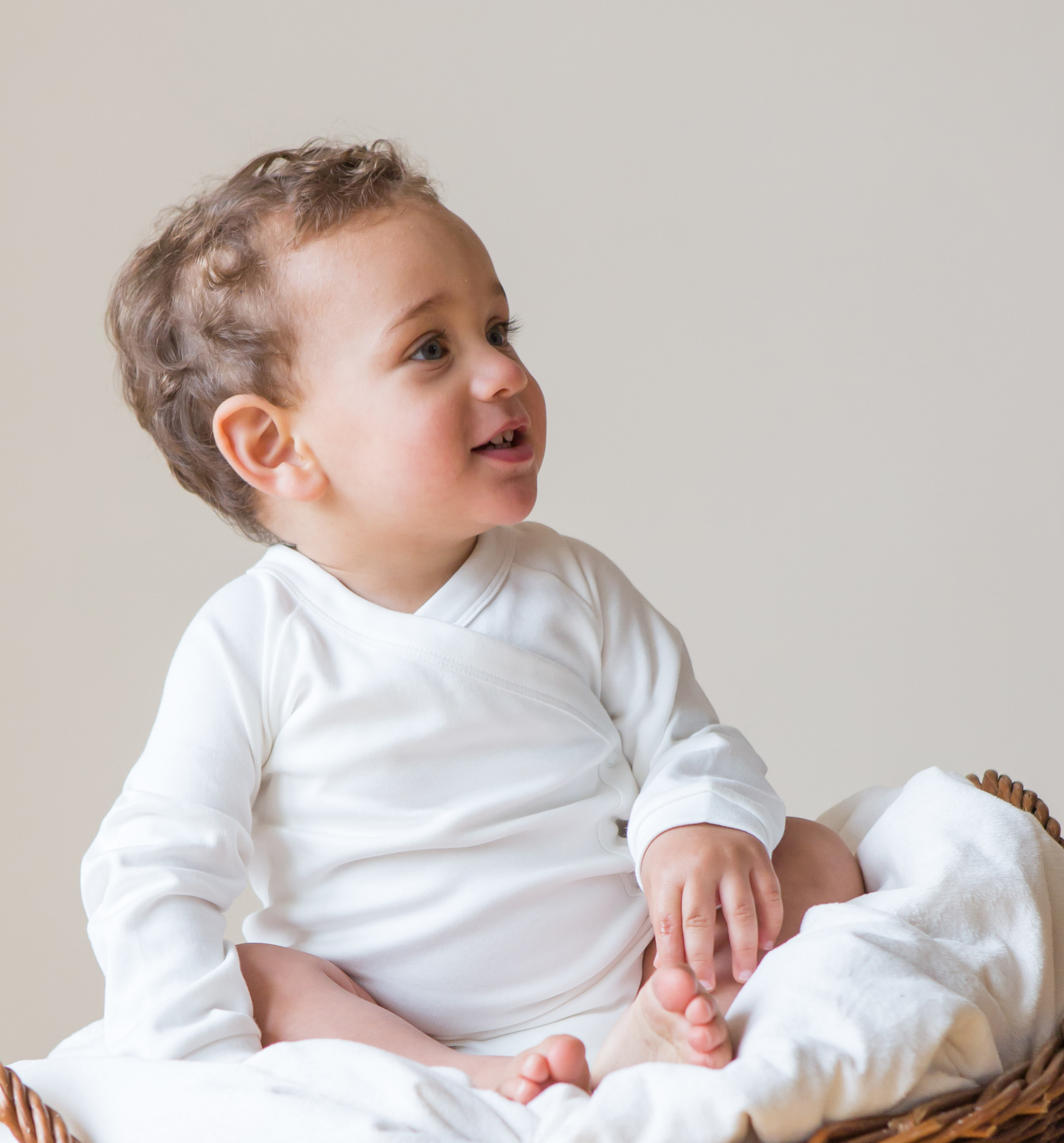 Wunderschöne, weiche Bio-Baumwoll-Wickelbodys mit langem Arm und "Kimono-Schnitt" für ganz entspanntes An- und Ausziehen. Mit zwei Druckknöpfen im Schritt, aus ungebleichter Baumwolle.