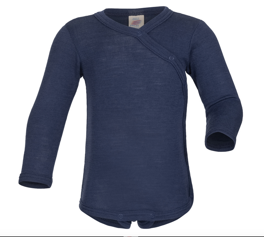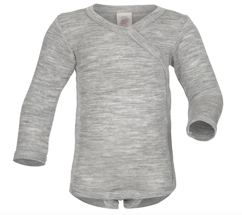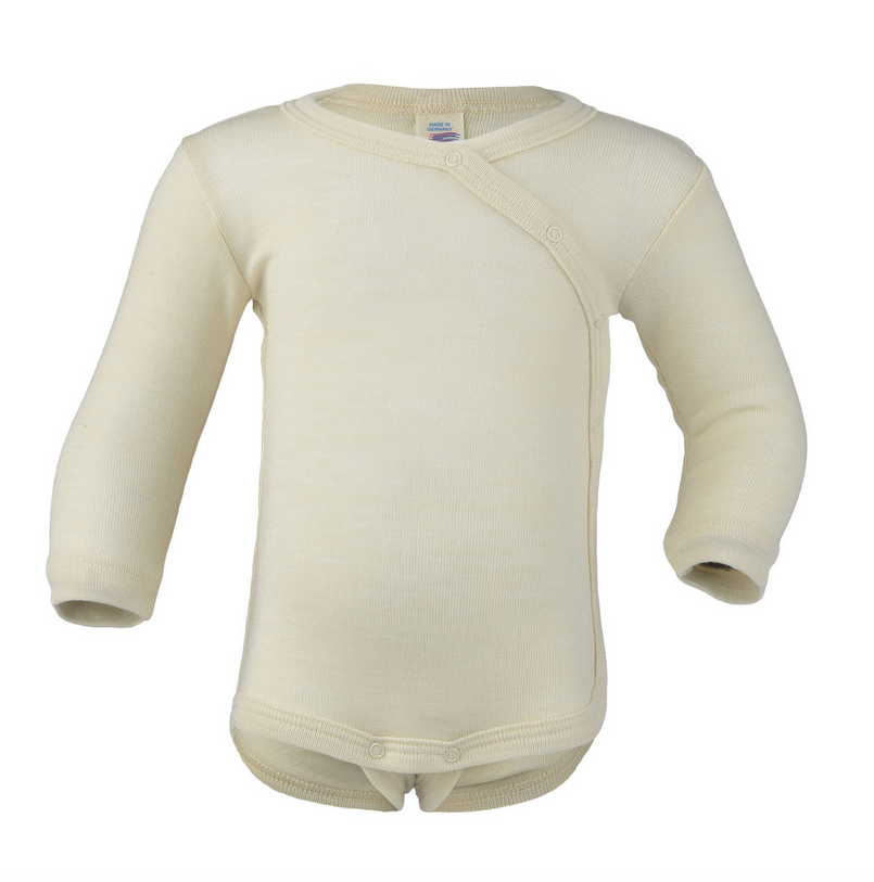 Langärmeliger Wickel-Body, aus 70% Wolle (kbT) und 30% Seide, Feinripp, von Engel Natur, GOTS-zertifiziert.
