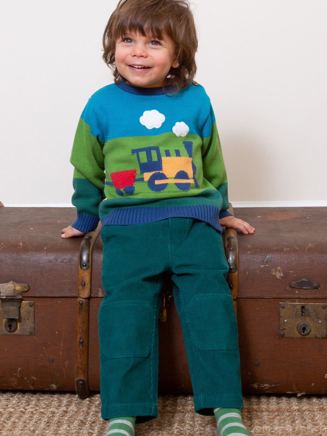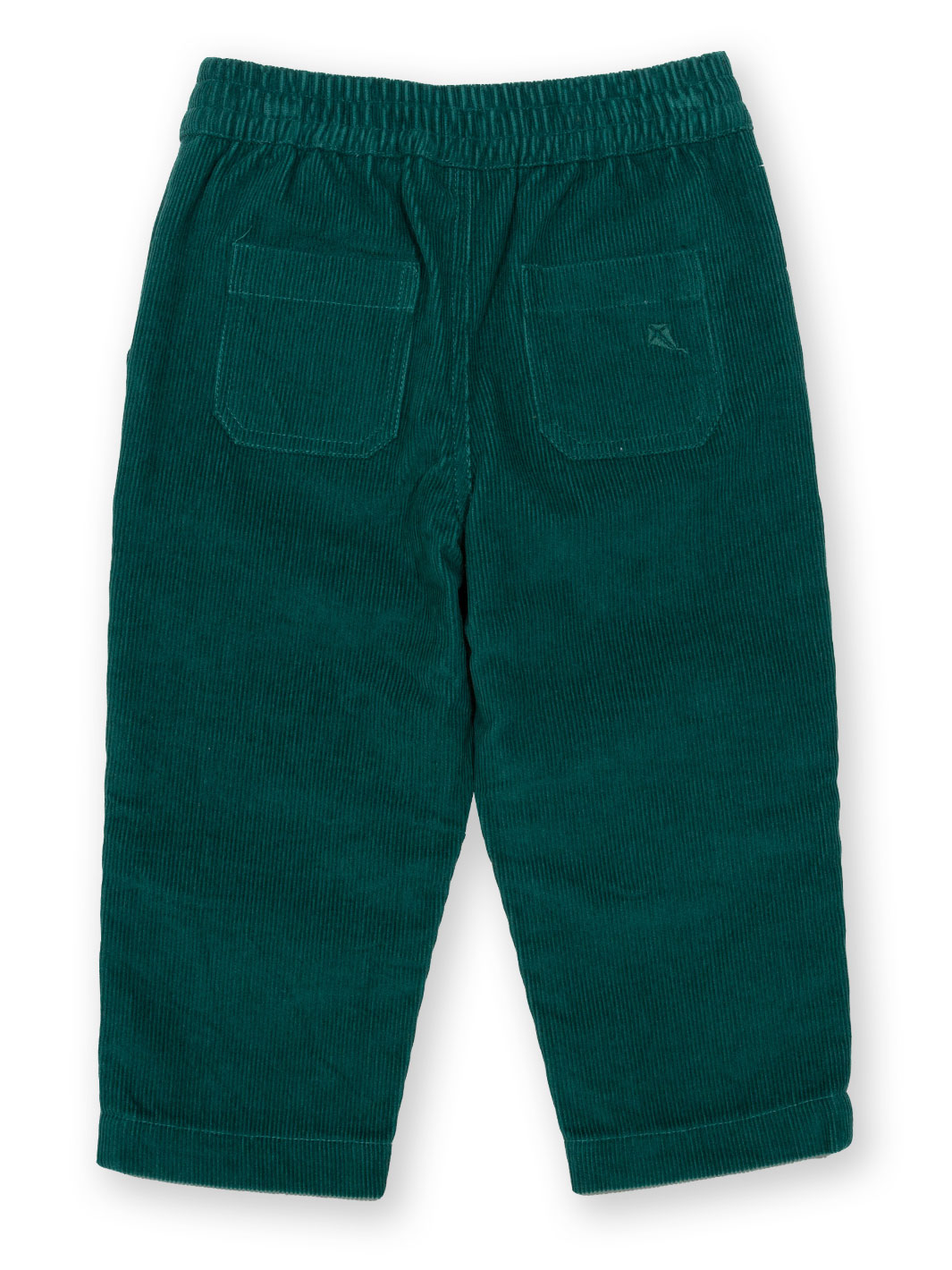 Diese samtig weiche Cordhose von Kite (UK) aus dunkelgrünem Feincord ist ruckzuck angezogen. Die Knie sind verstärkt, was die Hose noch mal deutlich robuster und langlebiger werden lässt. Zwei Taschen fürs Nastüechli und andere Schätze. Bändchen zum Weite regulieren am Hosenbund.