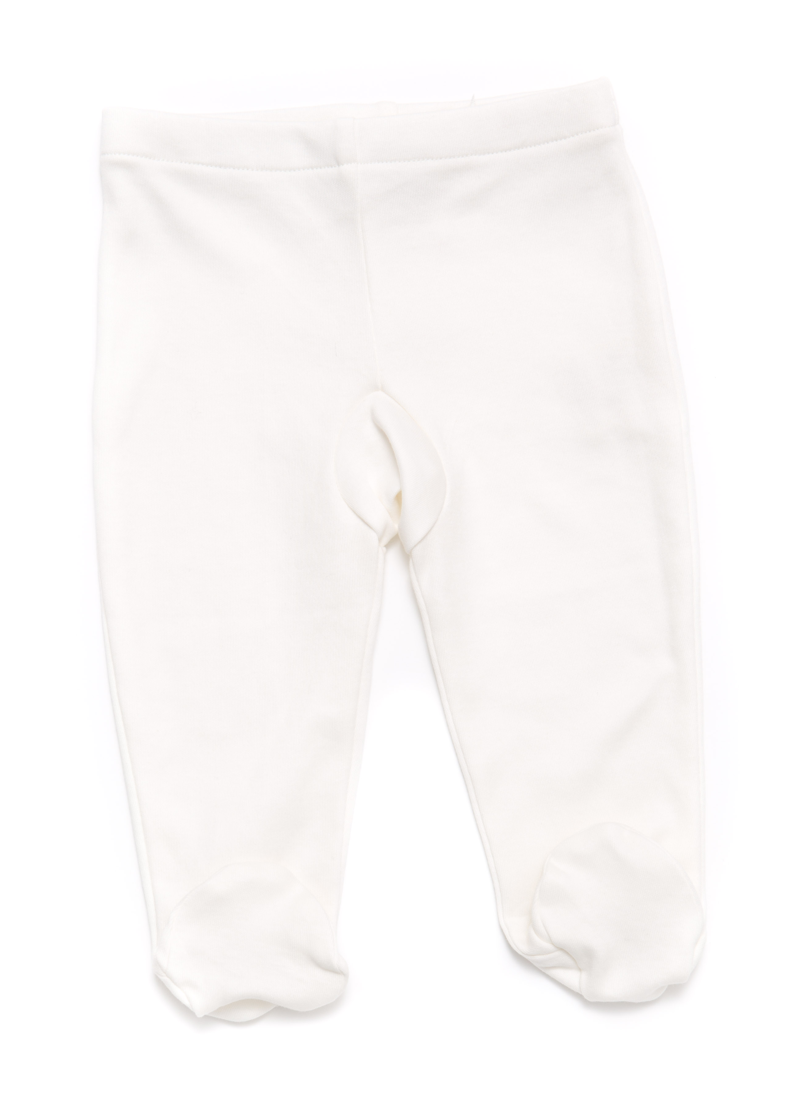 Wunderschönes, weiches Bio-Baumwoll-Strampelhöschen mit Fuss, aus ungebleichter Baumwolle.