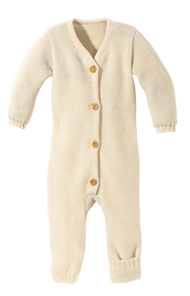 Herrlicher kleiner Strick-Overall für euer Neugeborenes. Für diesen Overall hat Disana Links-Strick gewählt - mit seinen grossen, offenen Maschen speichert er besonders viel Wärme und ist wunderbar weich. Links-Strick ist in alle Richtungen elastisch und macht so die ersten Strampelpartien problemlos mit. Breite, weiche Bündchen an Armen und Beinen sorgen dafür, dass dabei nichts verrutscht. Unterstrichen wird der edle Links-Strick durch vier große Holzknöpfe aus Buchsbaum-Holz zum einfachen An- und Ausziehen des Overalls. Mit bewährten Umklappstulpen an den Füssen - diese halten schön warm – auch mal ohne Socken oder Schühchen.