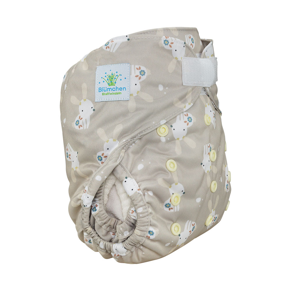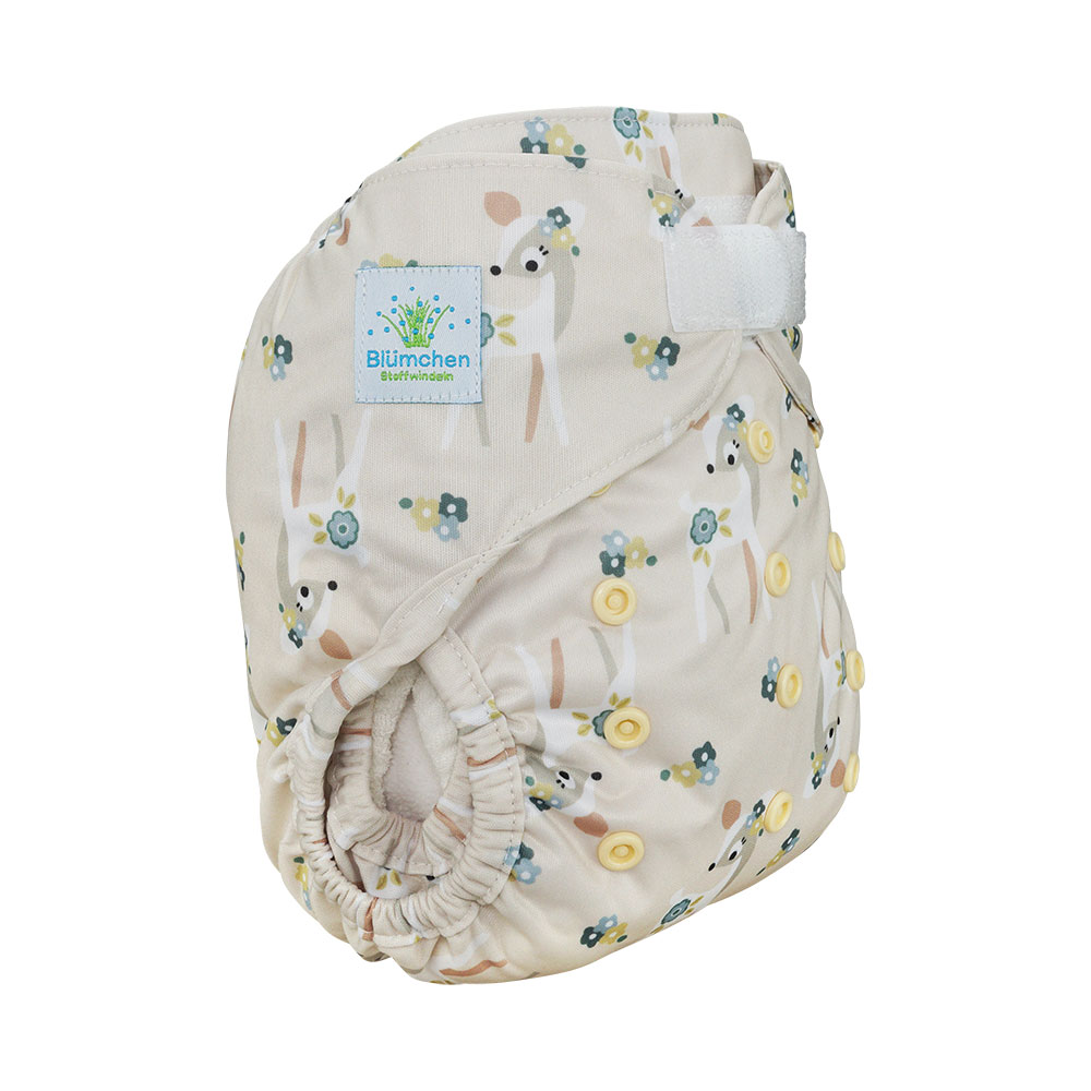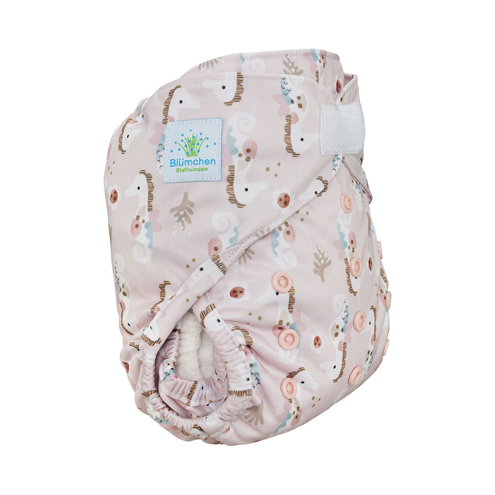 Eine super Alternative zu unseren immer wieder mal vergriffenen Capri-Überhöschen sind die Blümchen OneSize-Überhöschen mit doppelten Beinbündchen (Gehfalte), die sich auch an zarte Beine schön anpasst, Einlagen gut an Ort und Stelle hält und sich in vielen Windelzeit-Jahren bewährt hat. Das Überhöschen hat innen sogenannte Prefold-Laschen, in die man Einlagen platzieren kann. Klettverschluss mit Gegenklett (fürs Waschen) und der Möglichkeit des "Überklettens" für zarte Bäuchlein (man kann also das Überhöschen sehr schmal schliessen). Passt ab ca. 4 Kilo je nach Statur des Babys und verwendetem Saugmaterial. Kann dreifach verkleinert werden mit Hilfe der farbigen Druckknöpfe auf der Vorderseite. Funktioniert prima mit allen Arten von Saugmaterial: Prefolds, Mullwindeln, Höschenwindeln, einfache Einlagen.